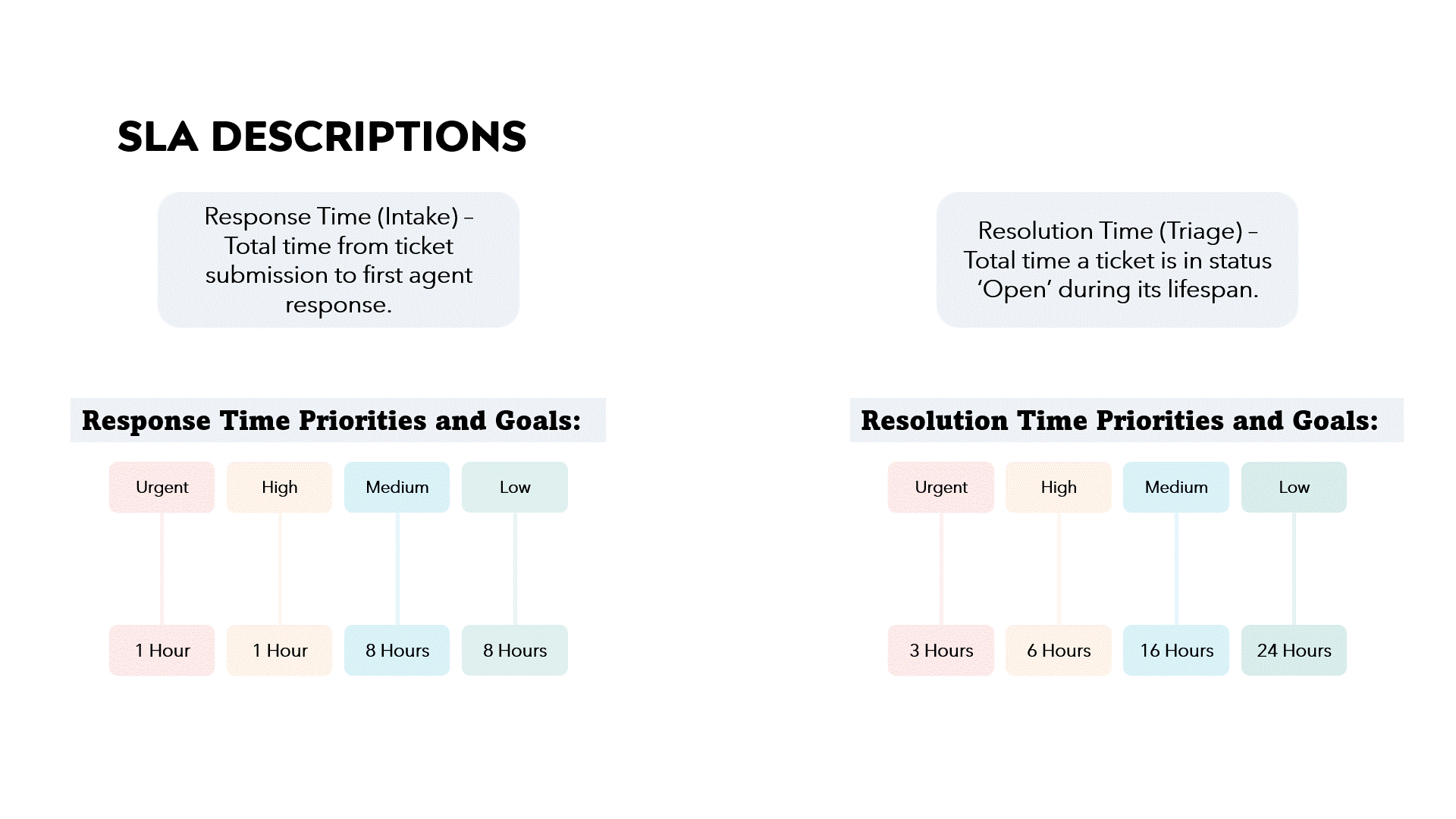 Below are our SLA goals and priorities for ticket resolution and response times (please see the definitions for each below).